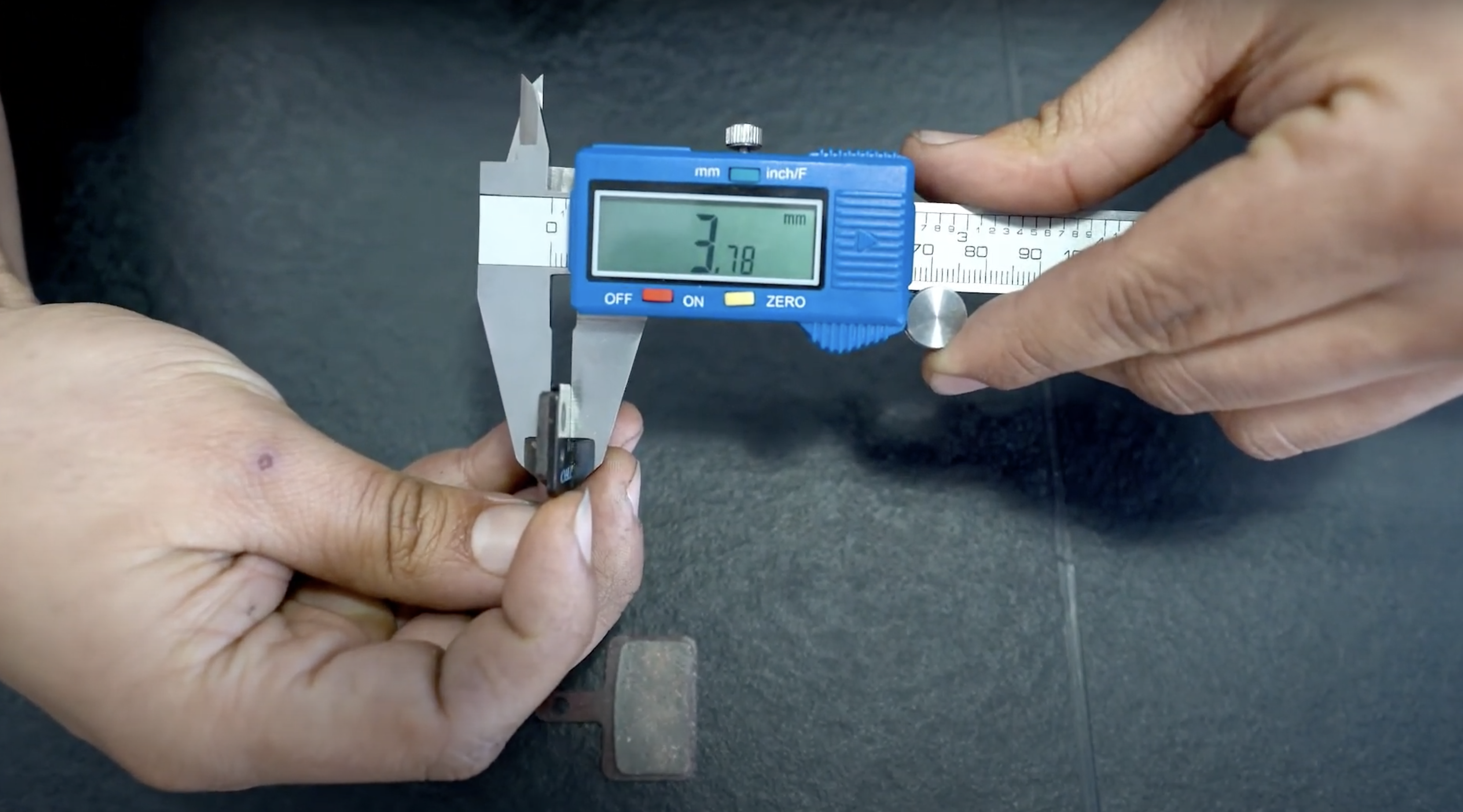 If your brake pads are each between 3mm and 4mm, they’re still in good shape and you can clean and reinsert them. If they come in below 3mm, it’s time to get new brake pads.