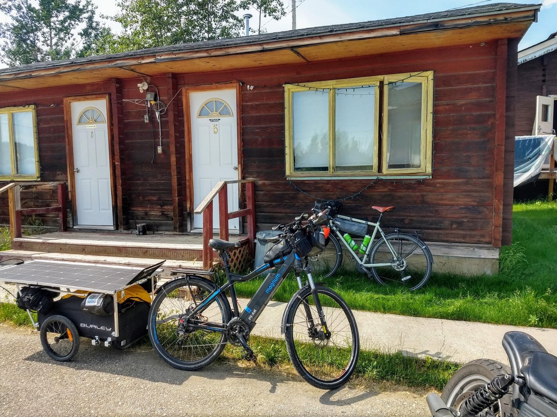 The Yukon summer with its 22 hours of sunlight meant Myles could plan a more ambitious trip. He equipped his Magnum bike with a 175-watt Renogy solar panel on a Burley Nomad trailer that charges the battery as he rides. "I have the 13ah stock battery fitted to the Magnum and an additional 26Ah battery in the trailer. Both charge and discharge in parallel. I built it hoping to get three days of cloudy overcast travel in excess of 120km. Since it was really sunny for most of this trip, and I didn't want to burn out my non-ebike biking buddy, we kept our mileage under 90km a day."